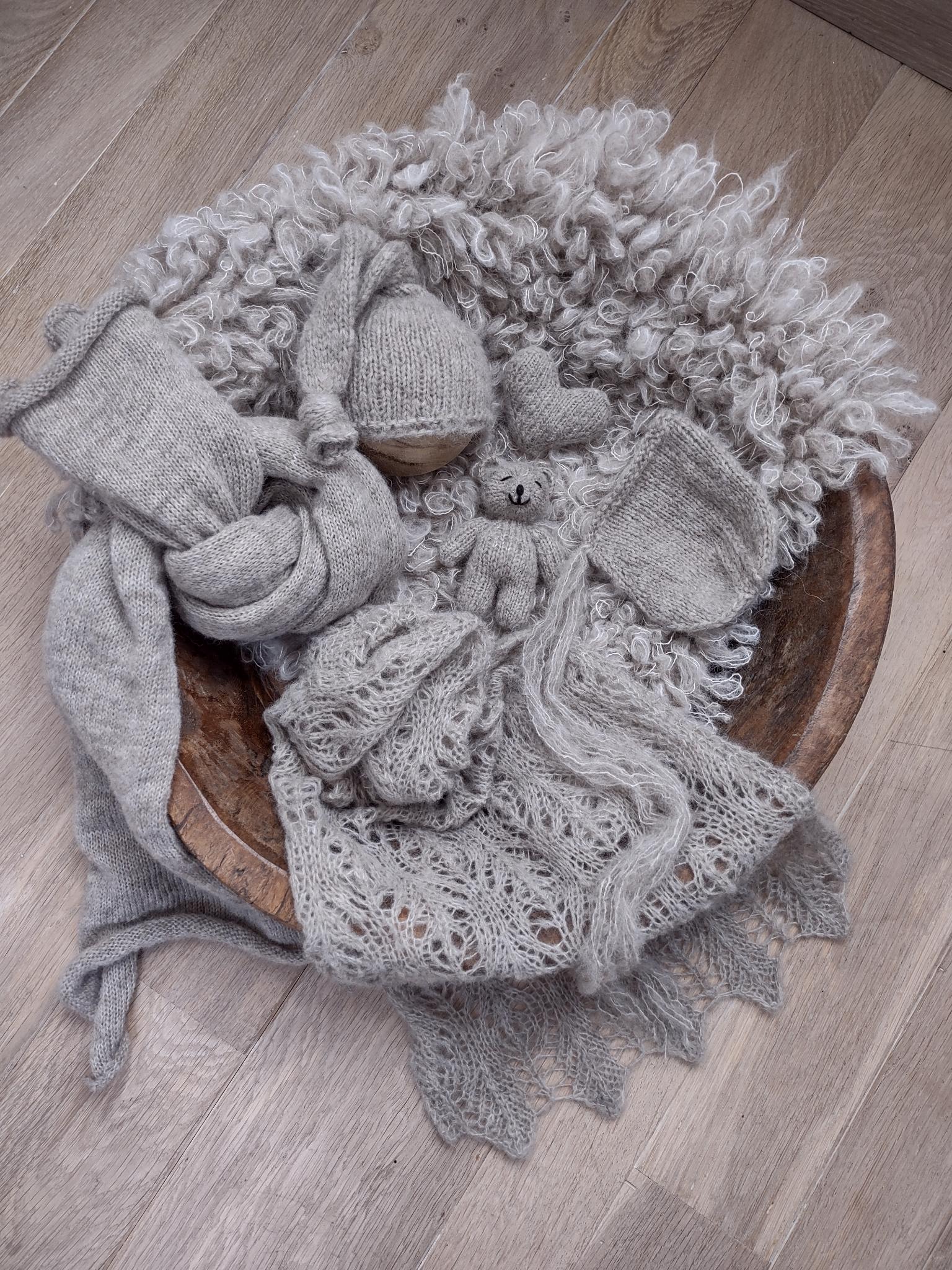 Set bestaande uit lussenbreisel, ajourwrap ca 95cm, tricotwrap ca 140cm, slaapmutsje, bonnetje, hartje en beertje.