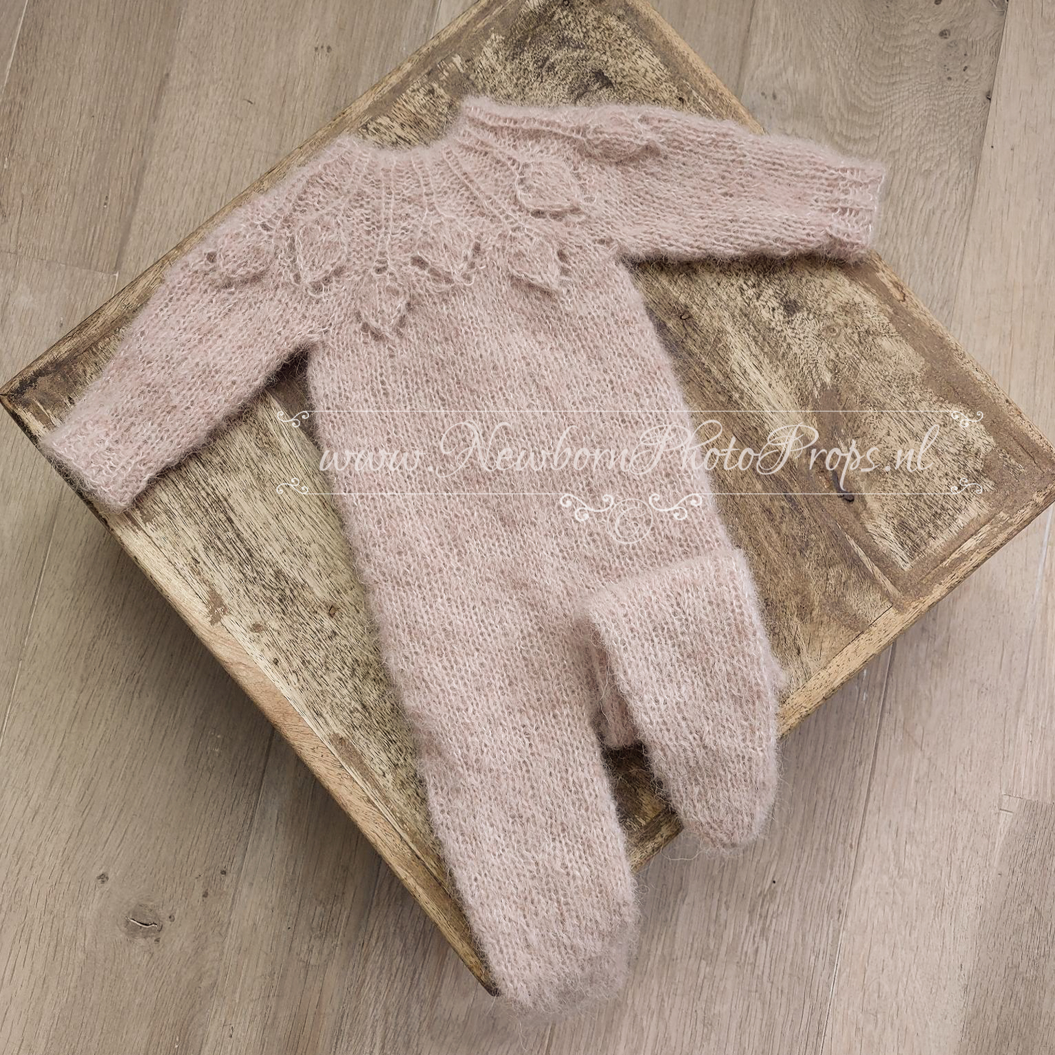 Onesie met ajourpatroon in de schouderpas; kan in allerlei kleuren besteld worden.